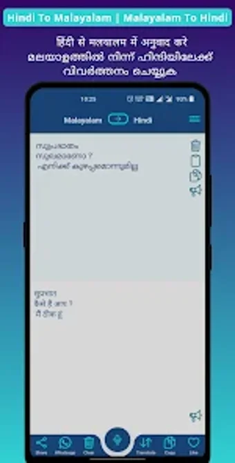 기본 및 다크 테마를 제공하는 말라얄람어 - 힌디어 번역기 앱은 시각적으로 매력적인 경험을 제공합니다. 또한 음성 번역을 지원하여 1초 이내에 즉시 번역을 제공합니다. 사용자는 음성으로 텍스트를 입력하거나 말라얄람어로 수동으로 입력하고 자동으로 힌디어로 번역할 수 있습니다. 마찬가지로, 힌디어로 입력하는 것은 말라얄람어 문자를 사용하여 자연스럽게 이루어집니다.